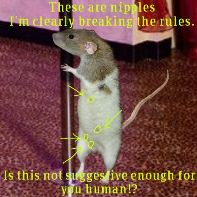 Hi so I'm a professional rat stripper. It's a little different than a human stripper, in the sense that I only strip for cheese. I hope this site doesn't mind if I posted this photo that clearly shows my rat nipples. I mean it says no nudity which I respect, but like I'm a rat and they don't make bras that fit me. Which is kind of how I got into stripping in the first place.